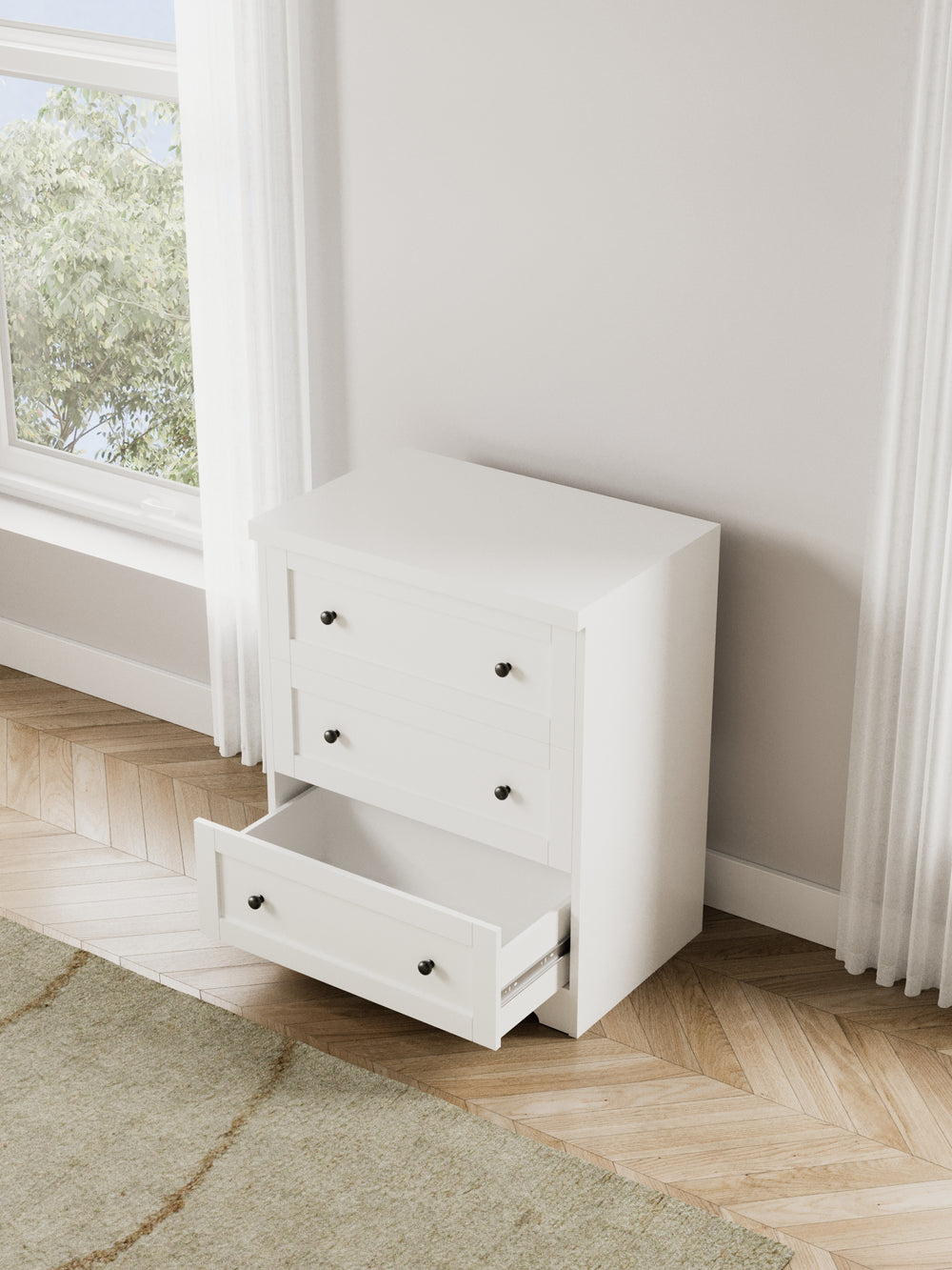 Add elegance and charm to your bedroom with the classic Hamptons design of the Louise White 3-Drawer Dresser.