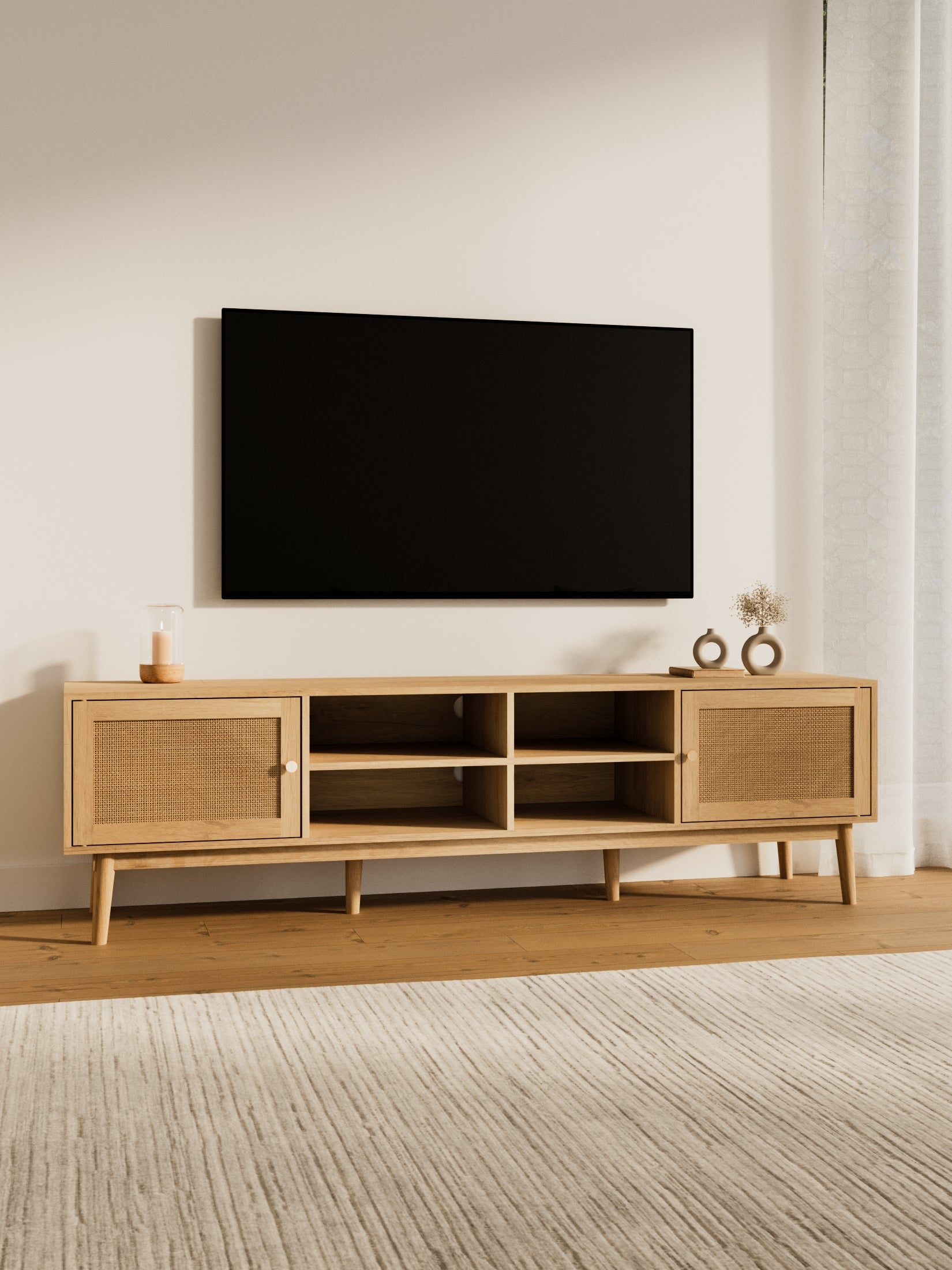 Upgrade your living space with the Sarah Natural Rattan Entertainment Unit. Its sleek design features authentic rattan cabinet doors, blending modern style with natural charm.
