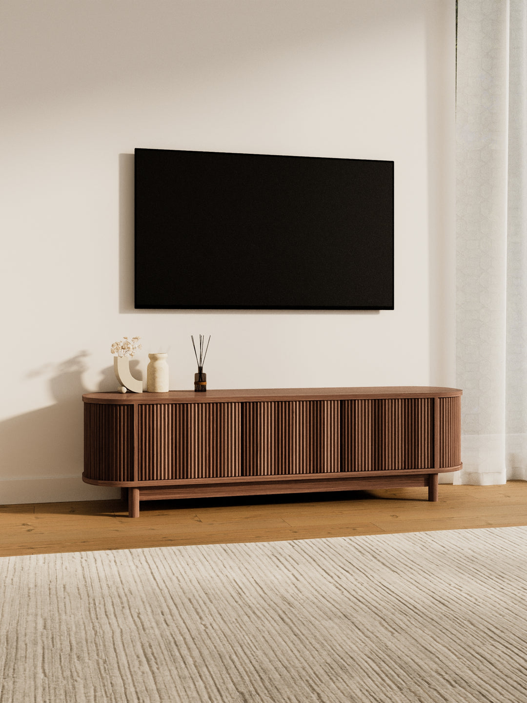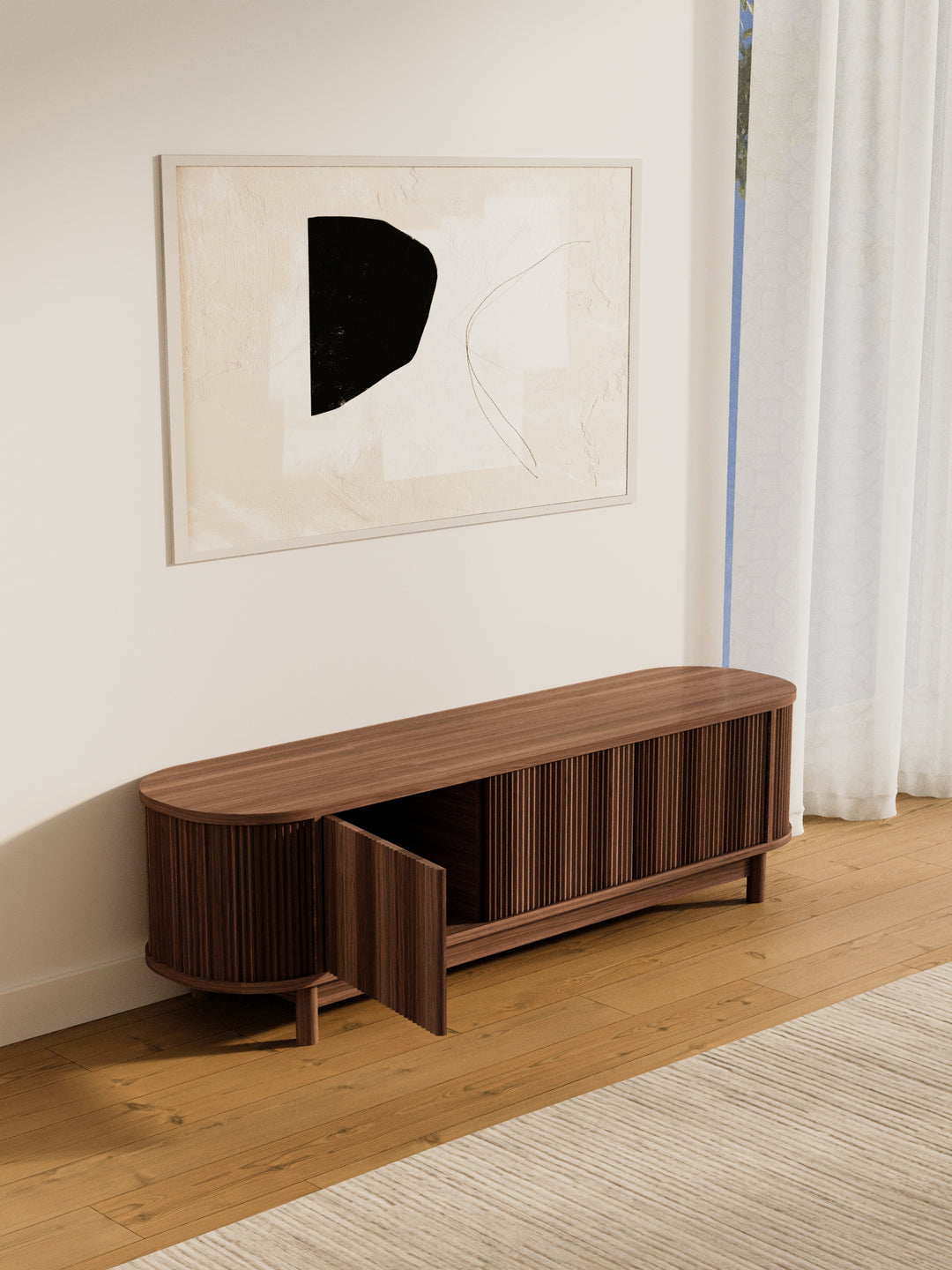 Oval silhouette with reeded cabinet fronts adds modern sophistication to any living room.