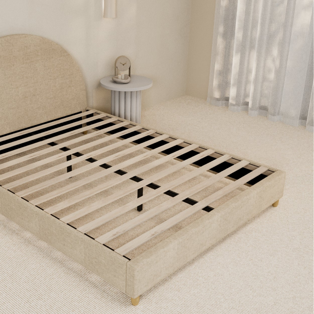 The Carla Curve Beige Bed Frame features a softly arched headboard, premium linen-look upholstery, and a sturdy timber frame for timeless style and comfort. With its solid slat system, seamless fit for Australian mattresses, and hassle-free assembly, it delivers durability, practicality, and everyday elegance in one.