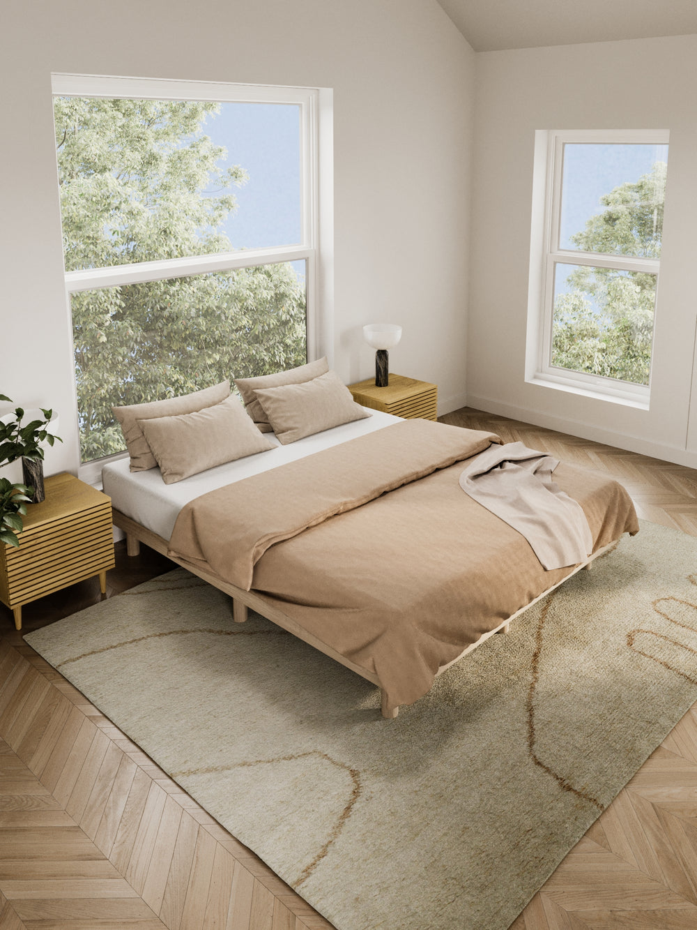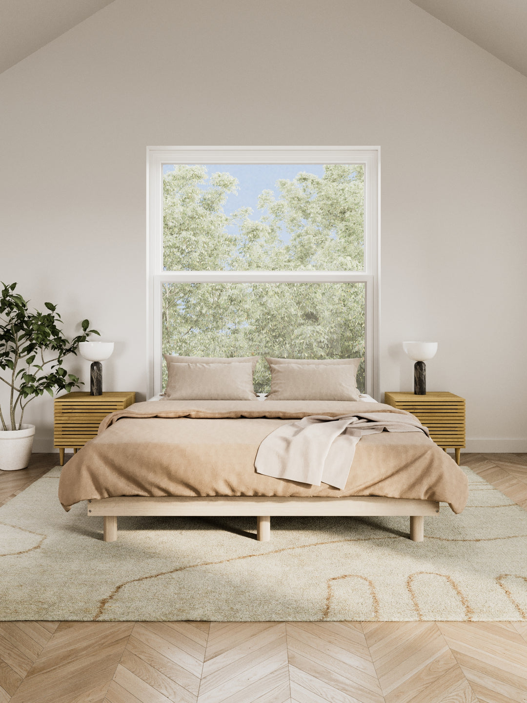 Contemporary bedroom featuring the Ventura Classic Wooden Bed Base in a clean, minimalist design. The natural light highlights the bed's sturdy construction and elegant finish, perfect for those looking to enhance their home with durable, stylish furniture. Paired with soft beige bedding and a lush view from the window, this bed base is ideal for modern décor enthusiasts.