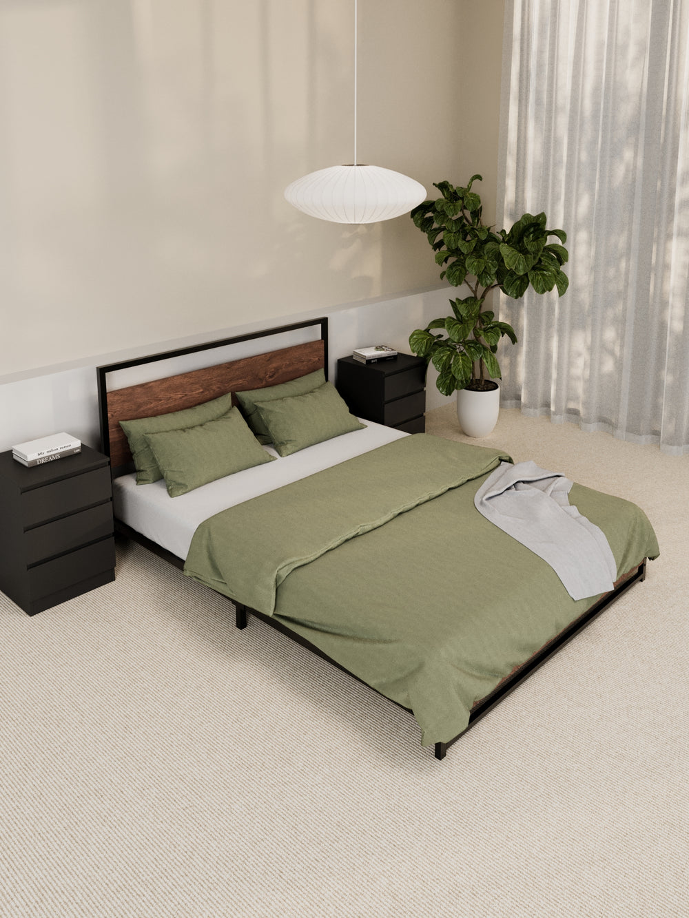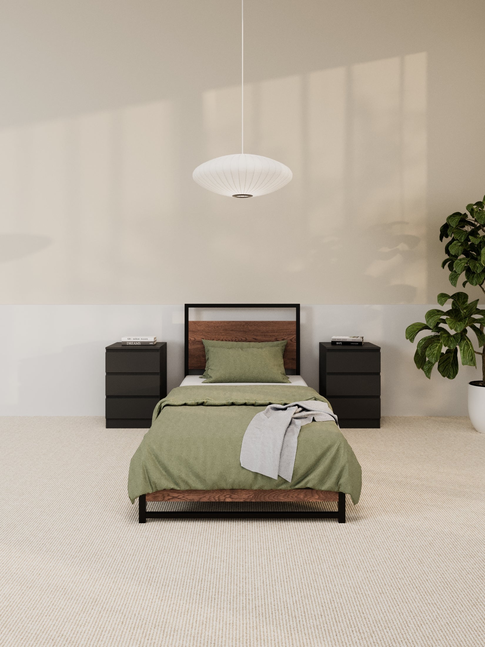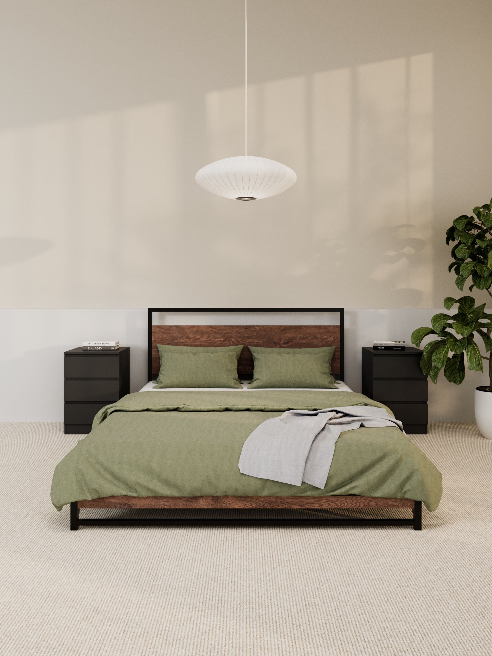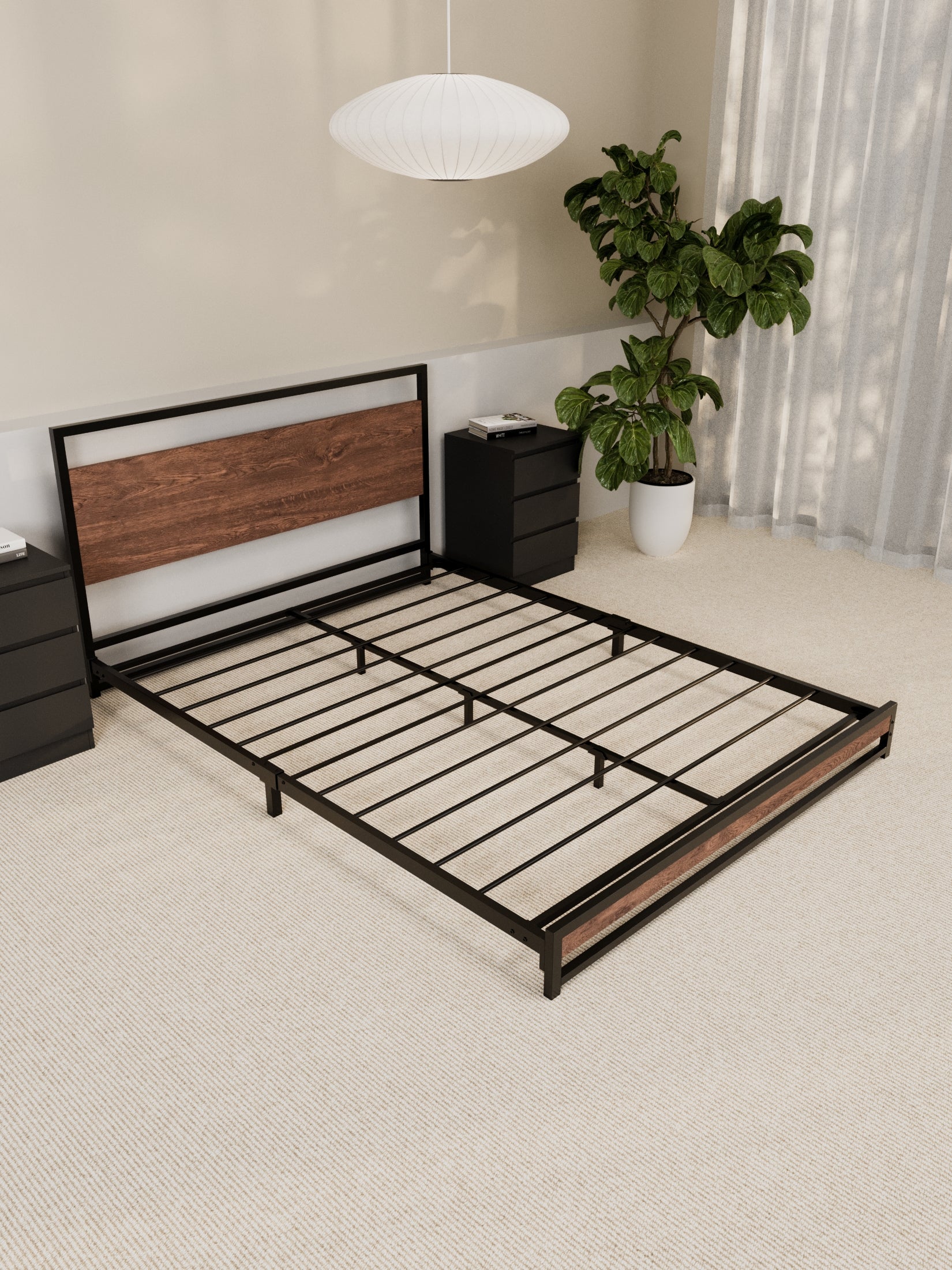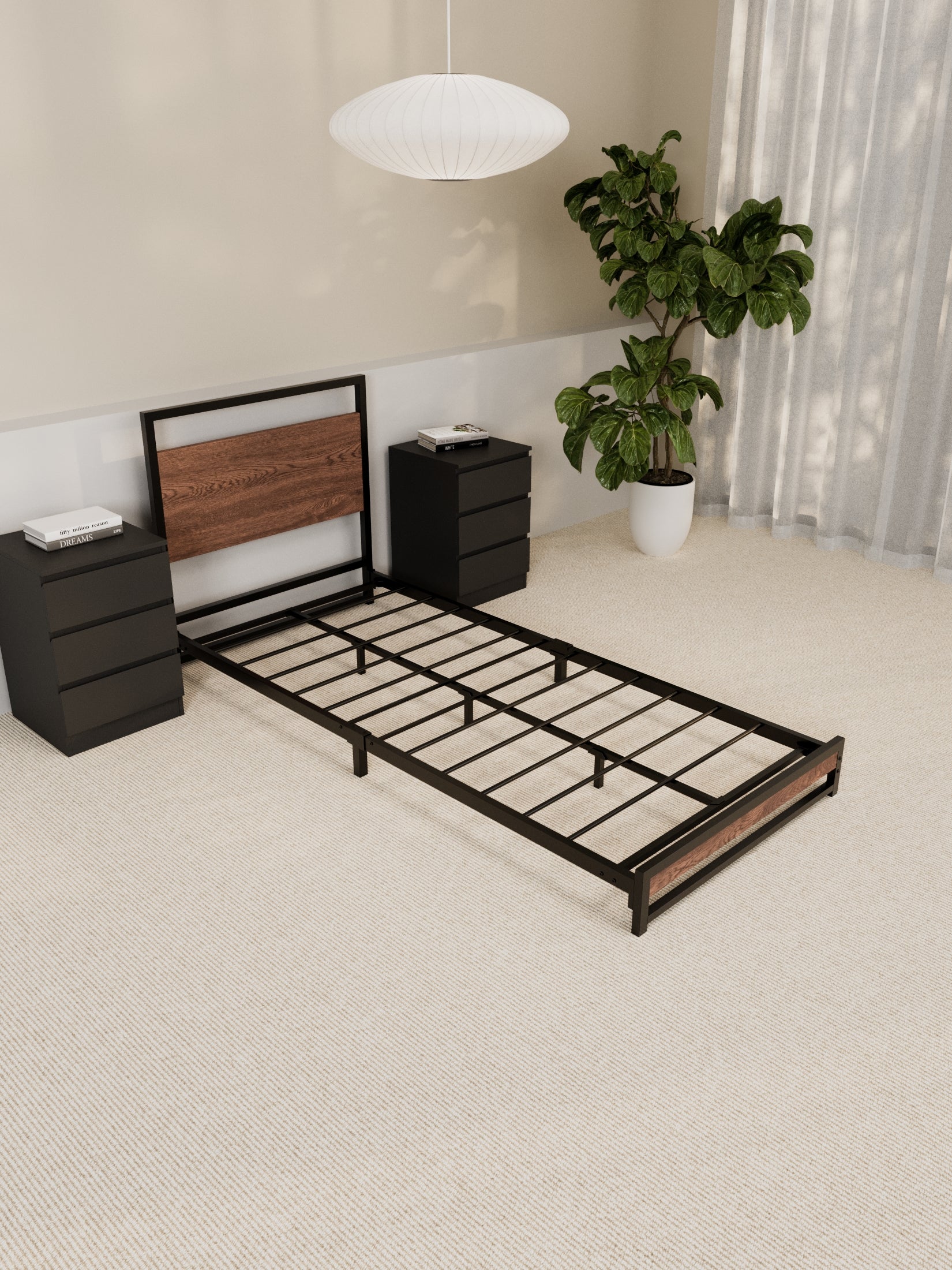 Transform your bedroom with the Cedar Metal Wooden Bed Frame, blending industrial style, strength, and functionality. Crafted with a sturdy powder-coated metal frame and wooden accents on the headboard and footboard, this bed frame offers modern sophistication and exceptional durability. The rust-resistant finish ensures long-lasting quality, making it perfect for any bedroom.