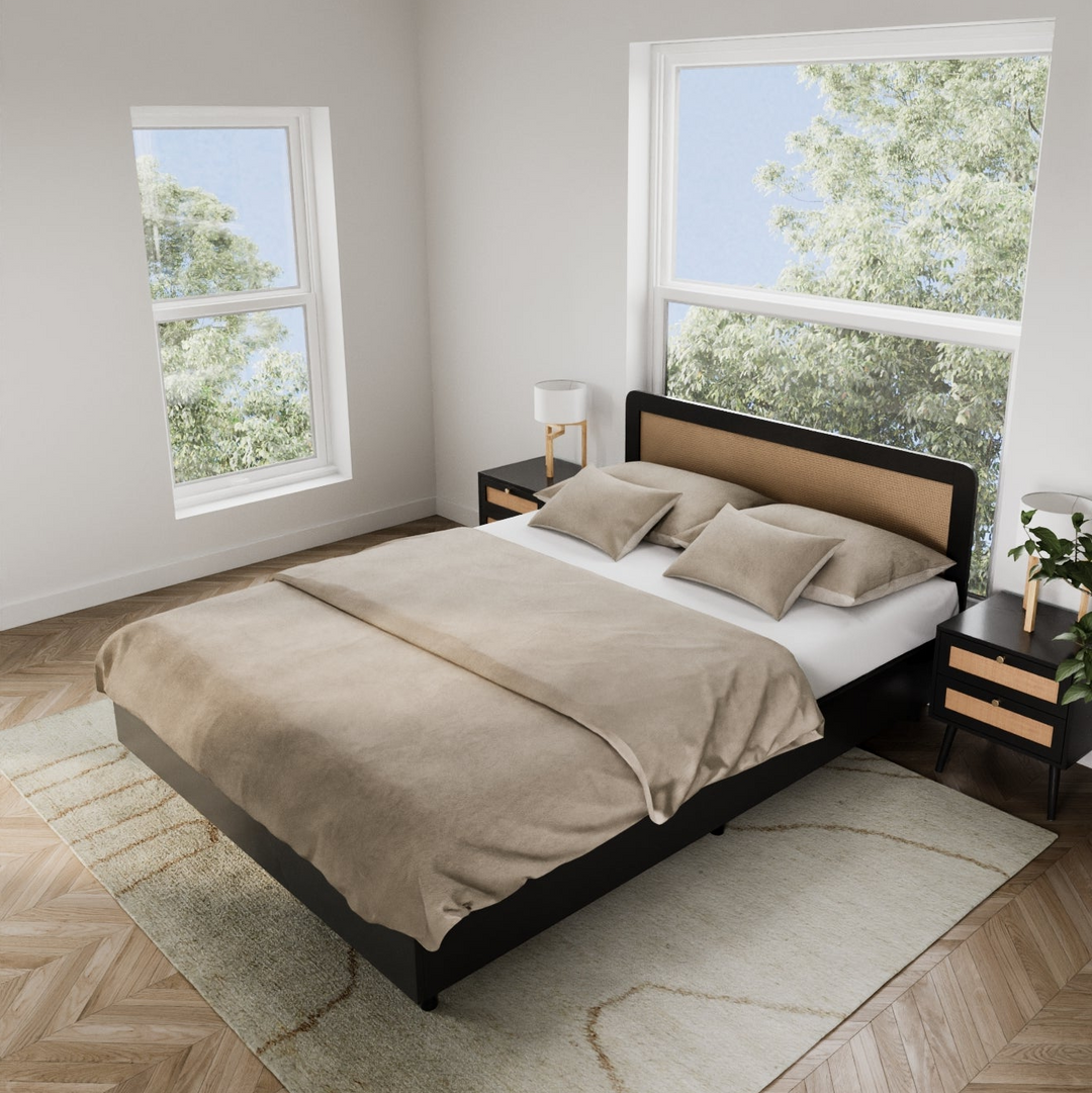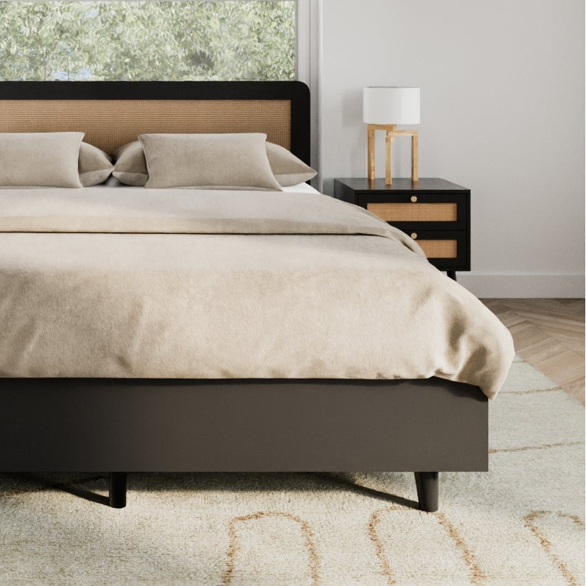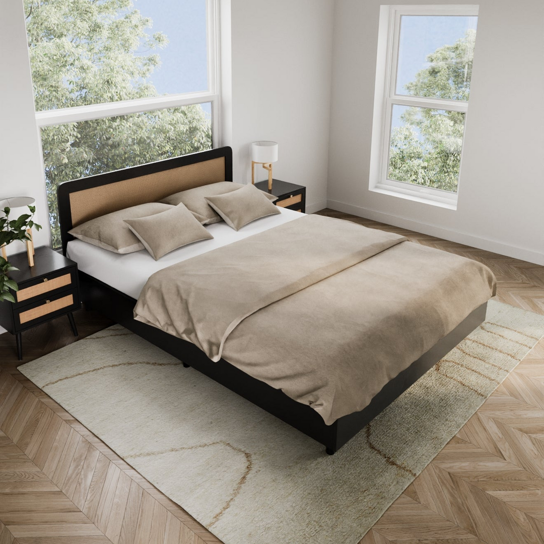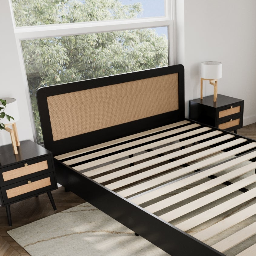 Elevate your bedroom with the Jodie Black Rattan Bed Frame, blending timeless charm with modern design. Featuring a handcrafted rattan headboard and sturdy timber frame, it offers natural elegance, durability, and everyday comfort.