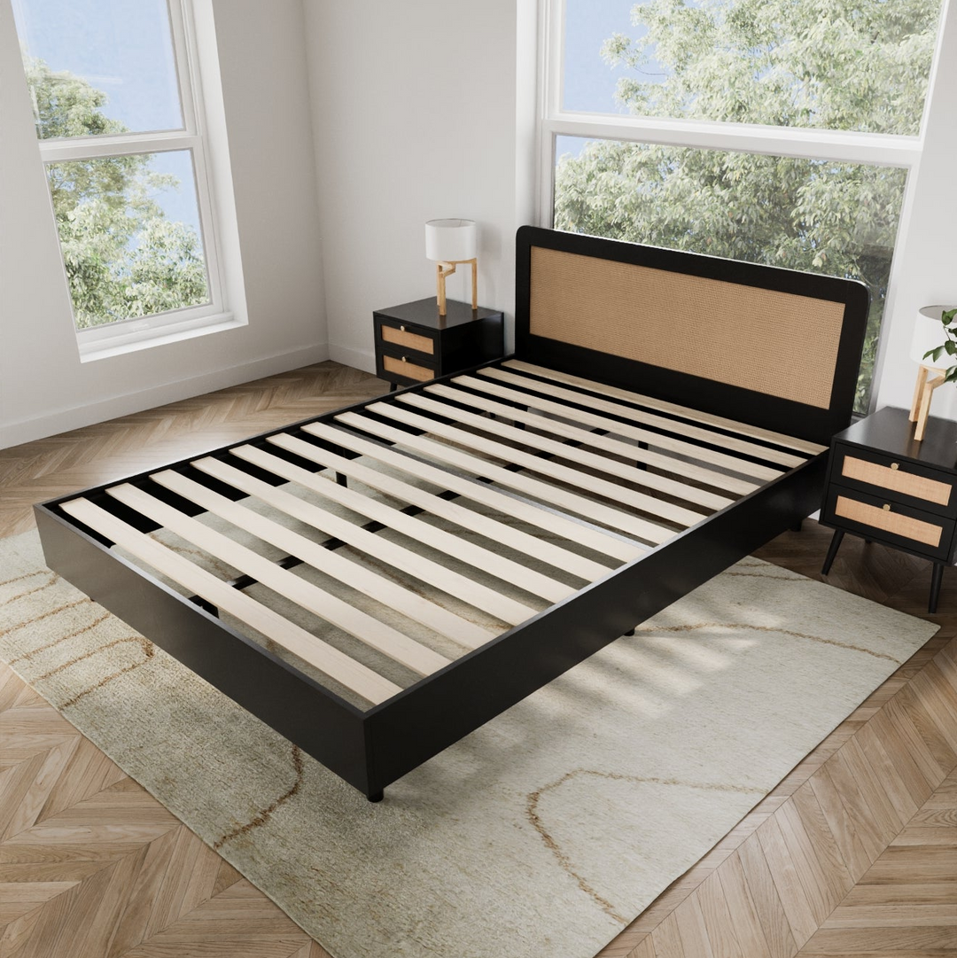 Designed with a durable metal support system and 13mm thick slats, it provides exceptional mattress support and long-lasting stability. The elegant rattan headboard also serves as a comfortable backrest - perfect for relaxed mornings or evening reading.