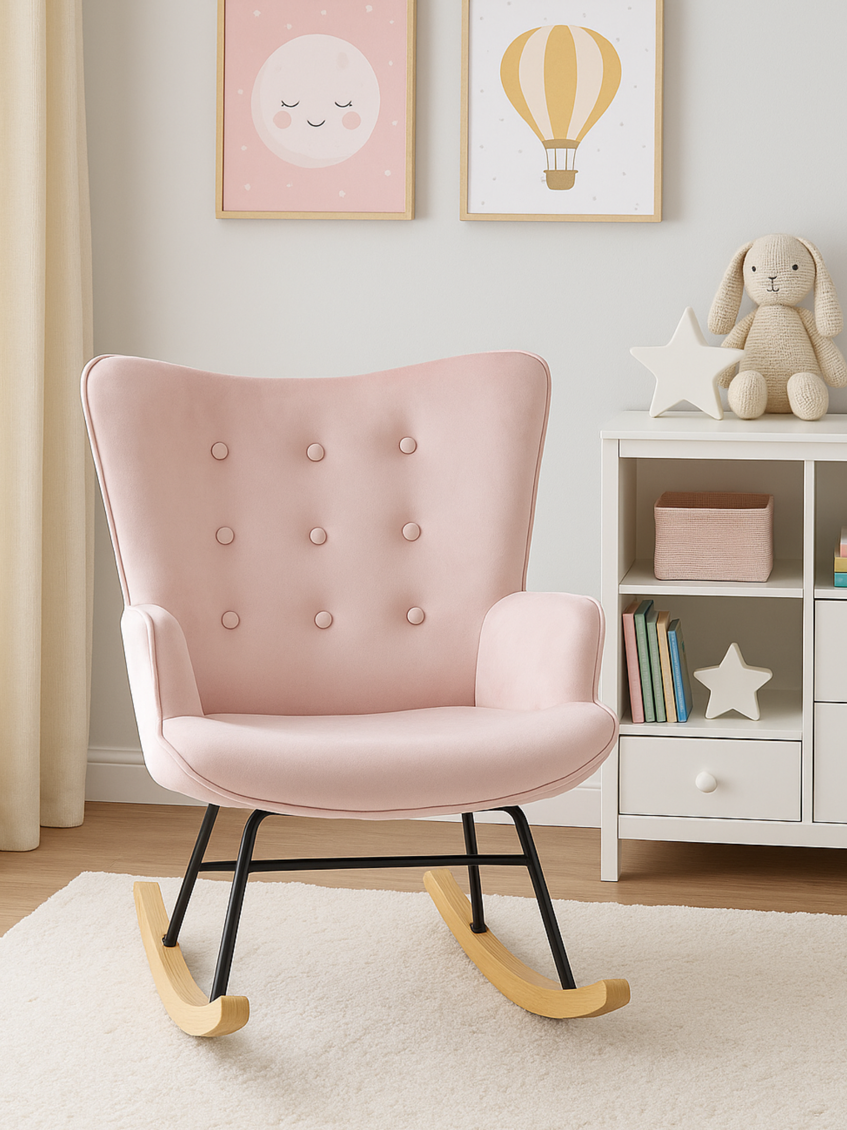 Create a calm and stylish space with the Mia Dream Pink Velvet Nursery Rocking Chair. Upholstered in soft pink velvet, it offers a smooth rocking motion, plush cushioning and a supportive high back, perfect for feeding, soothing or relaxing. With its sturdy build and elegant finish, it is a dreamy addition to any nursery or cosy corner.
