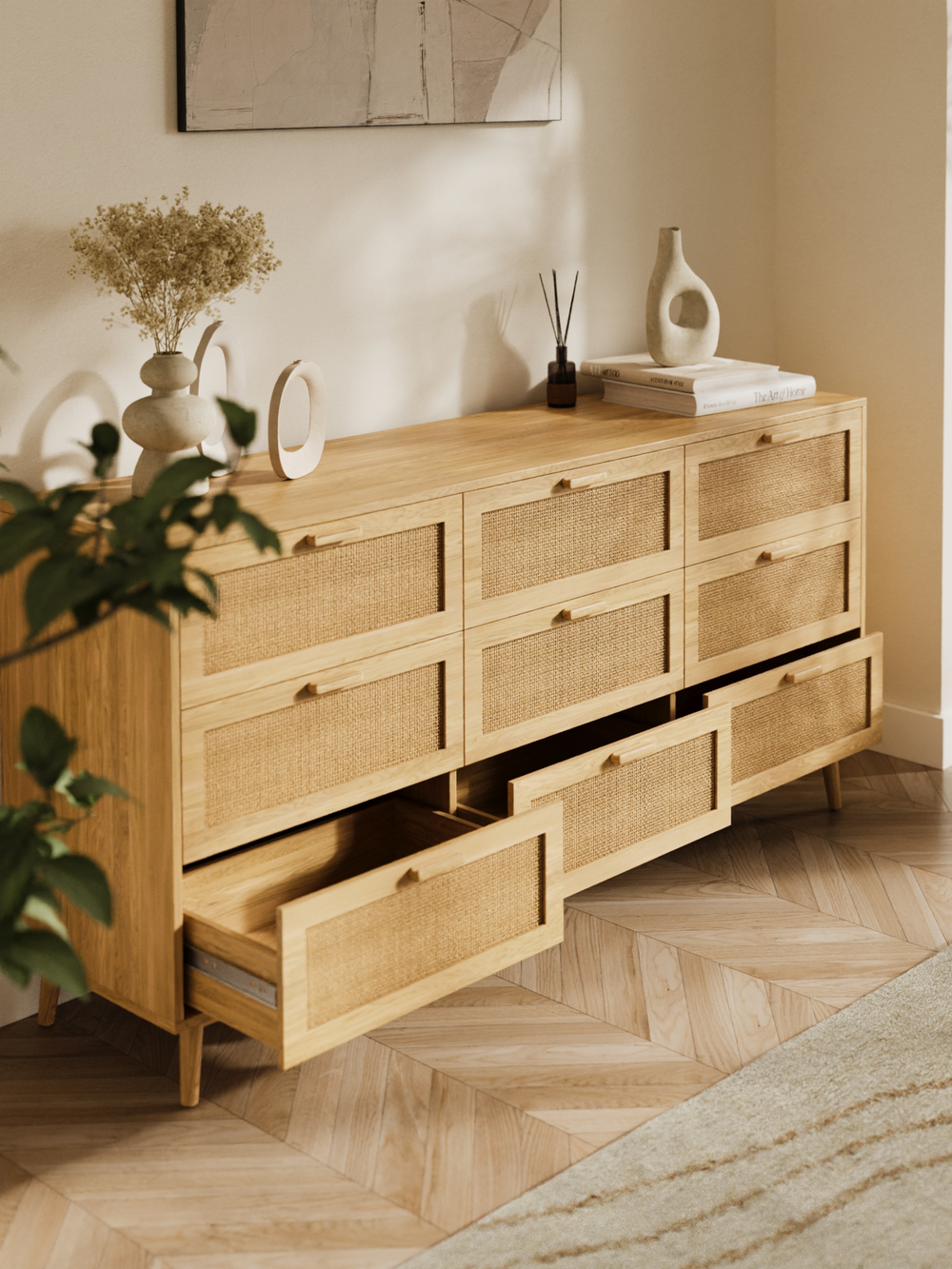 Transform your space with the Naomi Natural Rattan 5-Drawer Dresser, a perfect blend of elegance and functionality. The stunning combination of genuine rattan door panels and oak wood handles brings a natural warmth to your home.