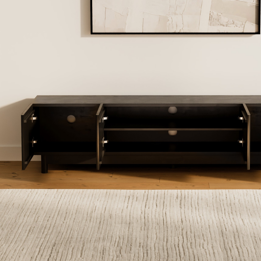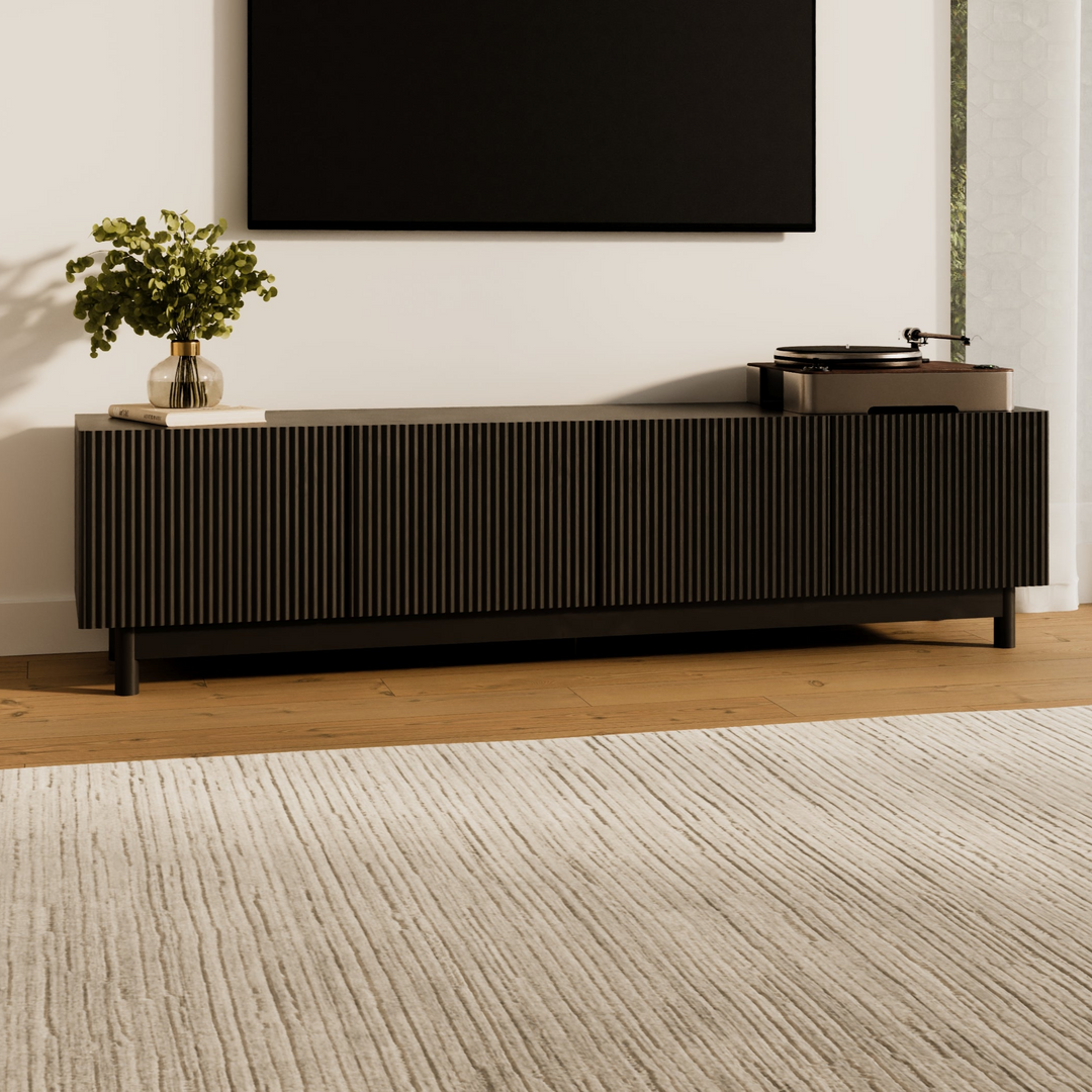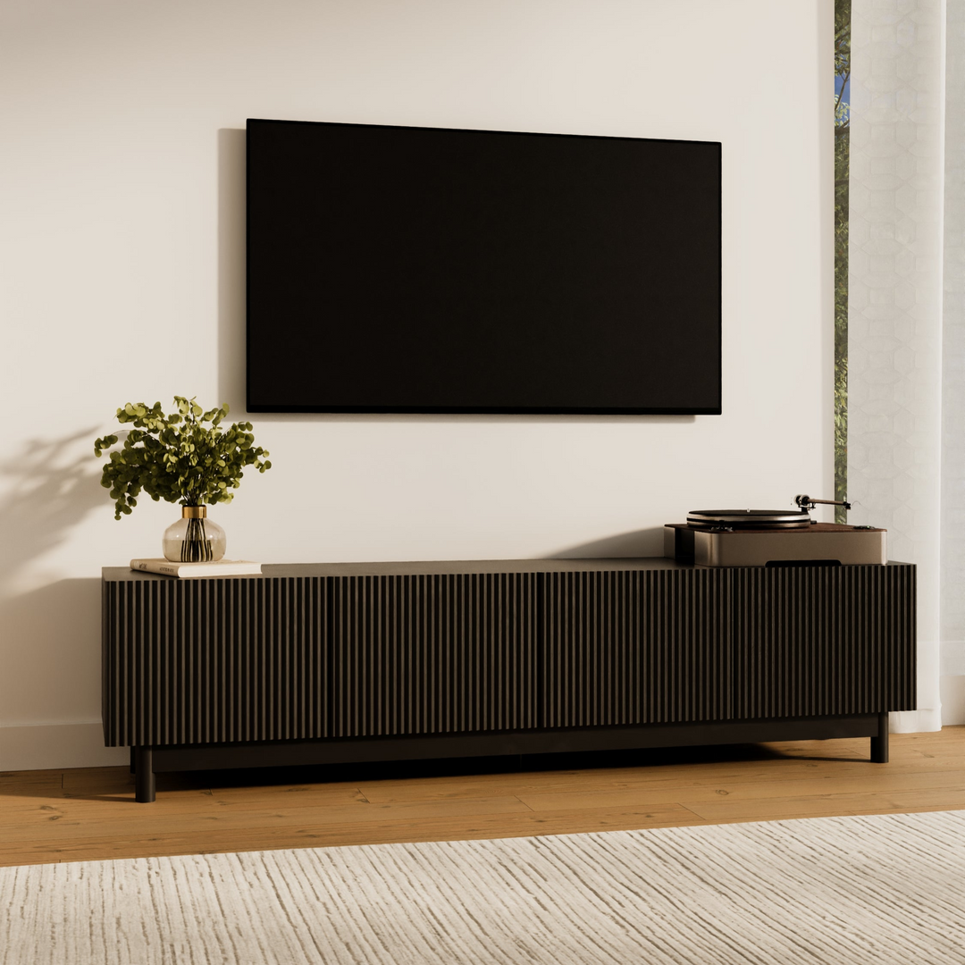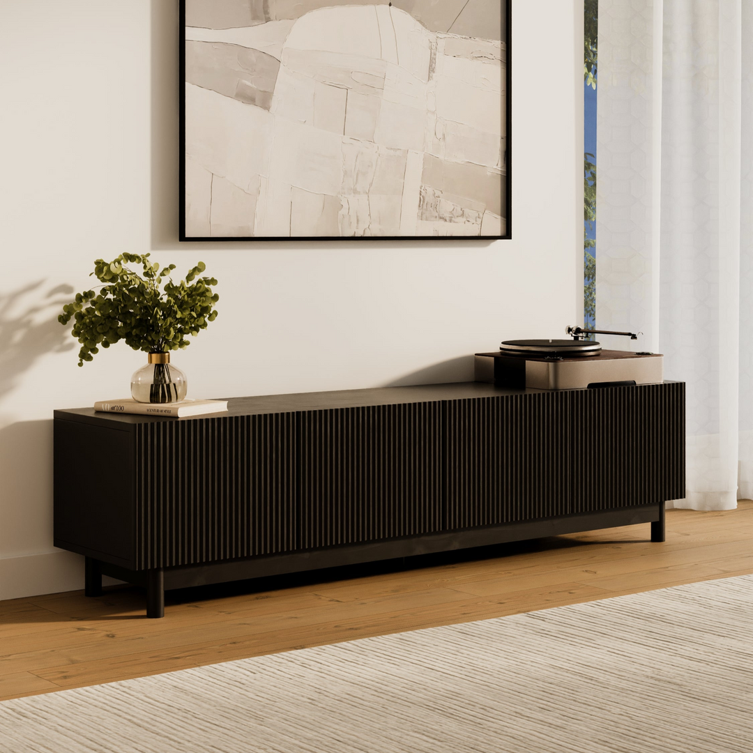 The Fiano Premium Black Entertainment Unit brings bold modern style with its matte black finish and reeded cabinet fronts. Designed for both elegance and practicality, it offers generous storage and lasting durability.