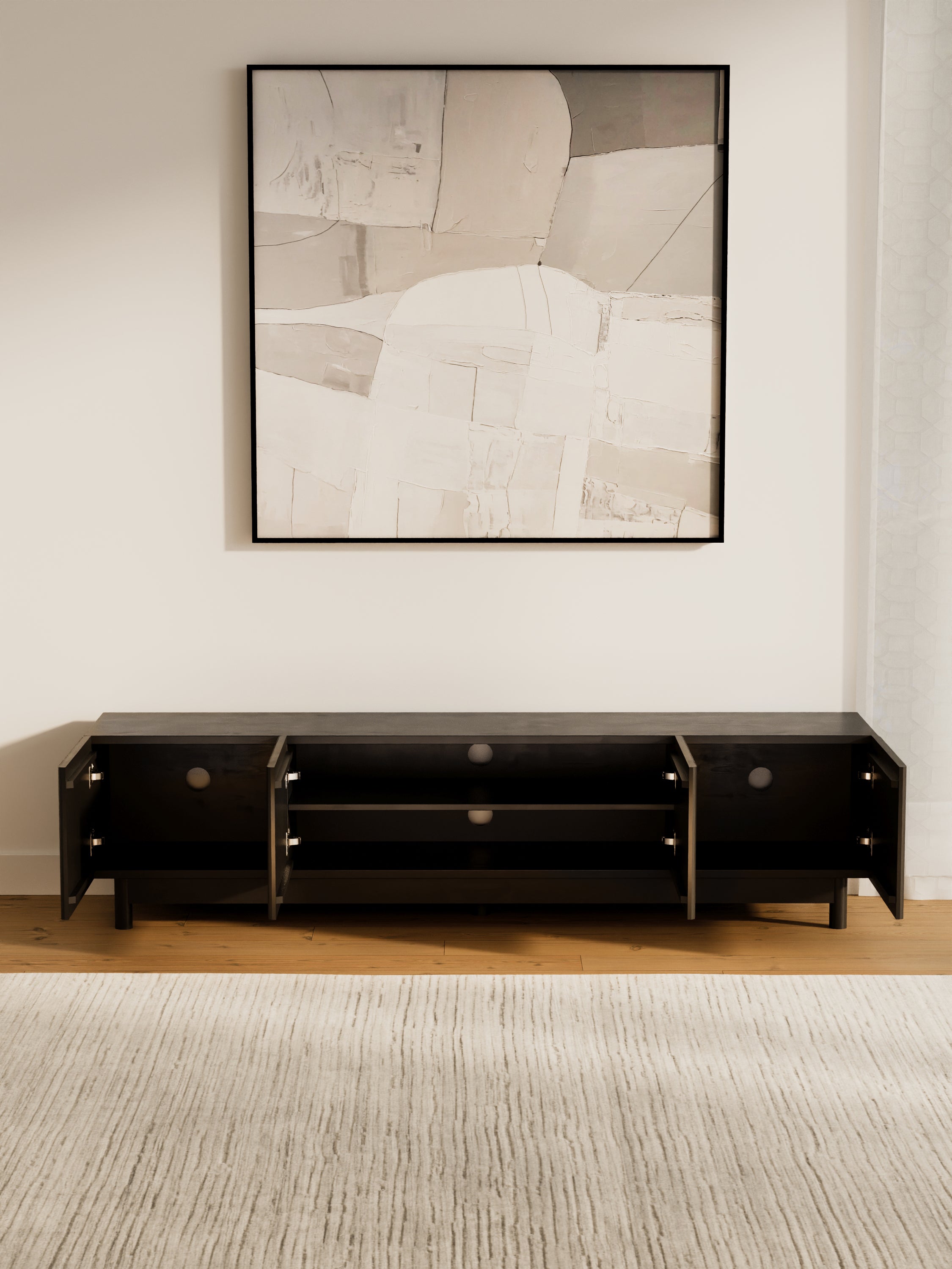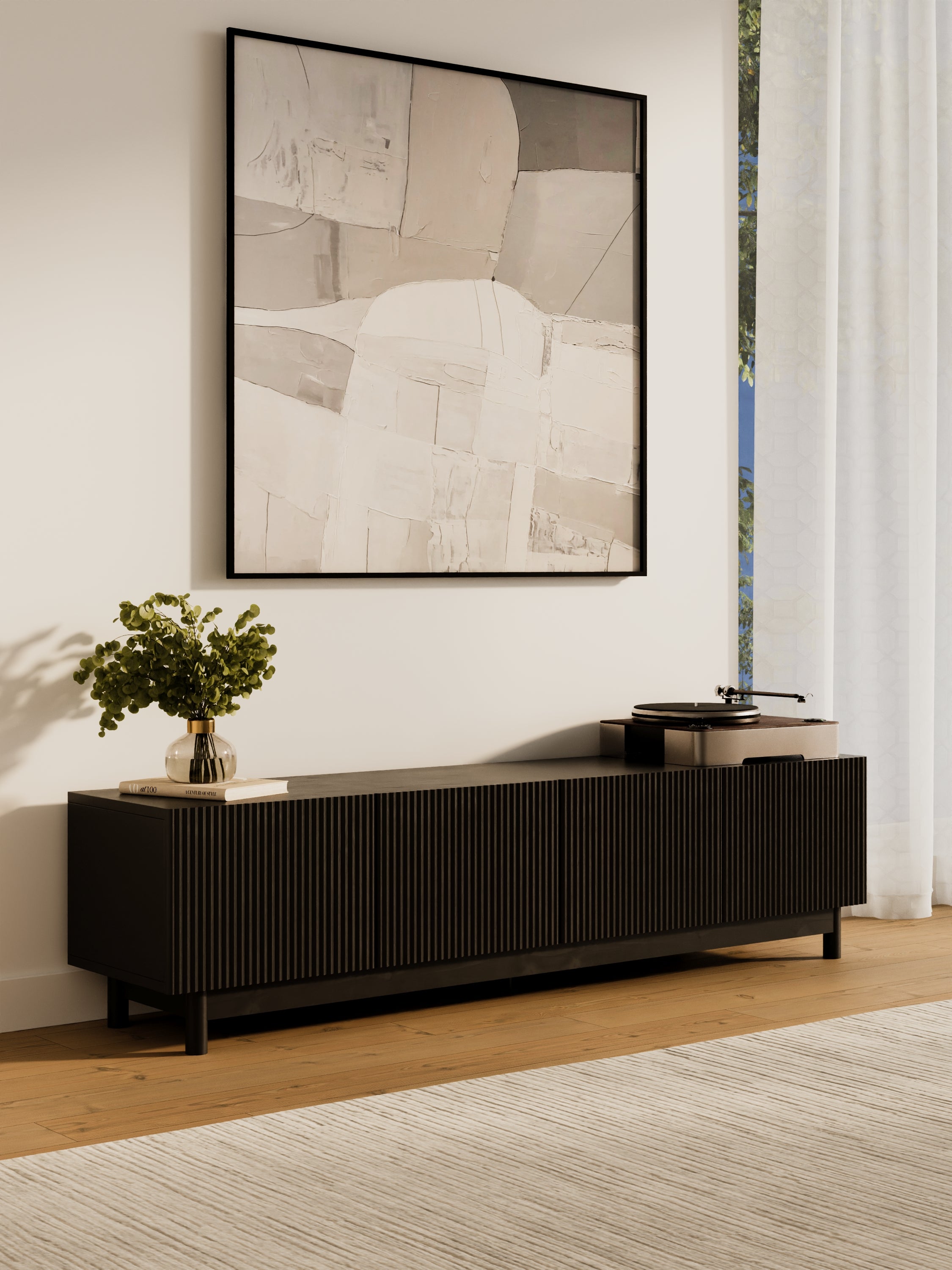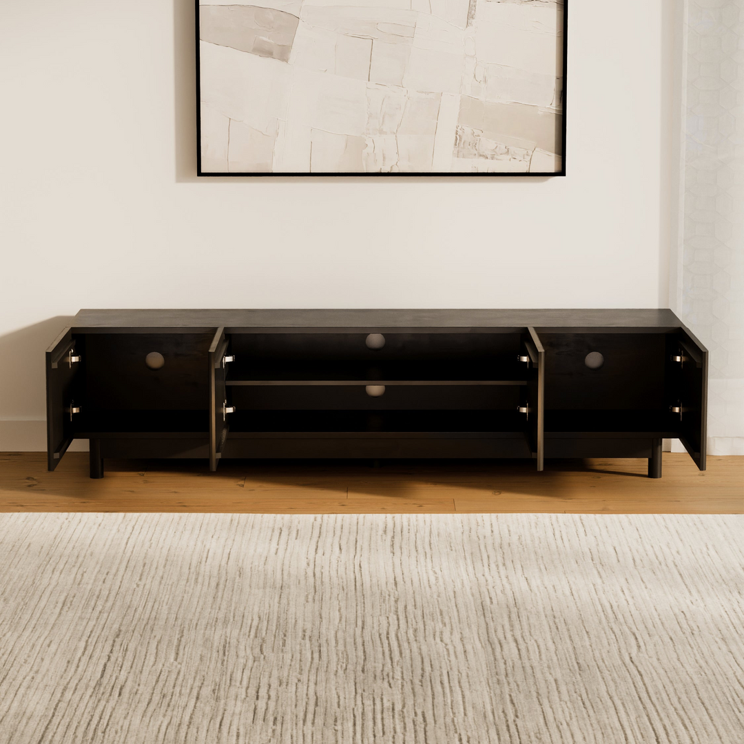 The Fiano Premium Black Entertainment Unit brings bold modern style with its matte black finish and reeded cabinet fronts. Designed for both elegance and practicality, it offers generous storage and lasting durability.