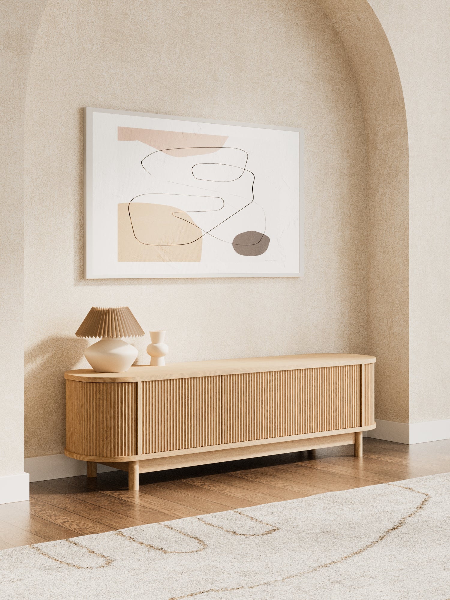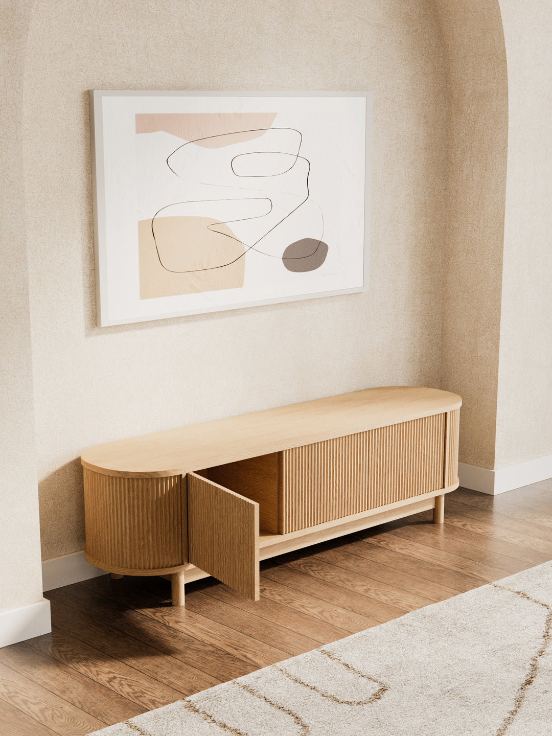 Oval silhouette with reeded cabinet fronts adds modern sophistication to any living room.