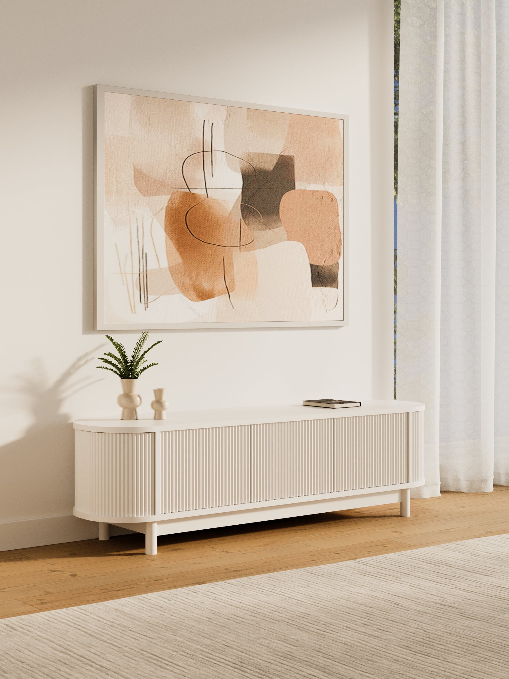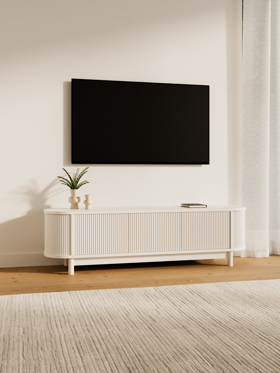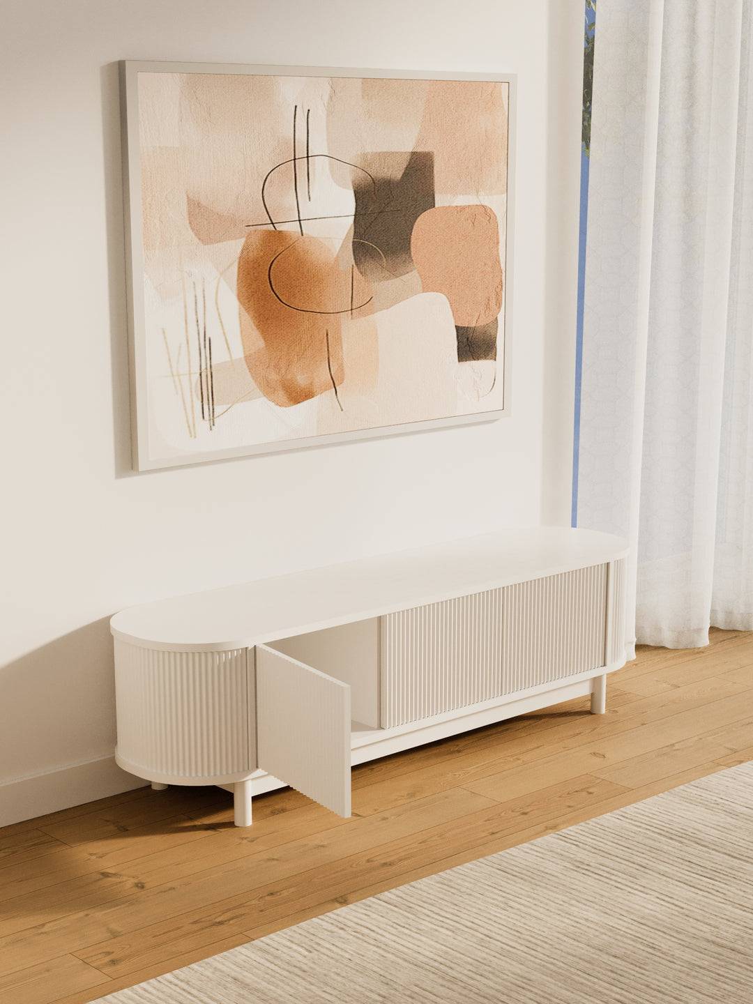 Upgrade your living room with the Zephyr Curved Entertainment Unit, featuring a modern oval design, reeded cabinet fronts, ample storage, durable construction, and built-in cable management. Available in 4 timeless colourways to suit any space - NaturalBlack, Walnut and White