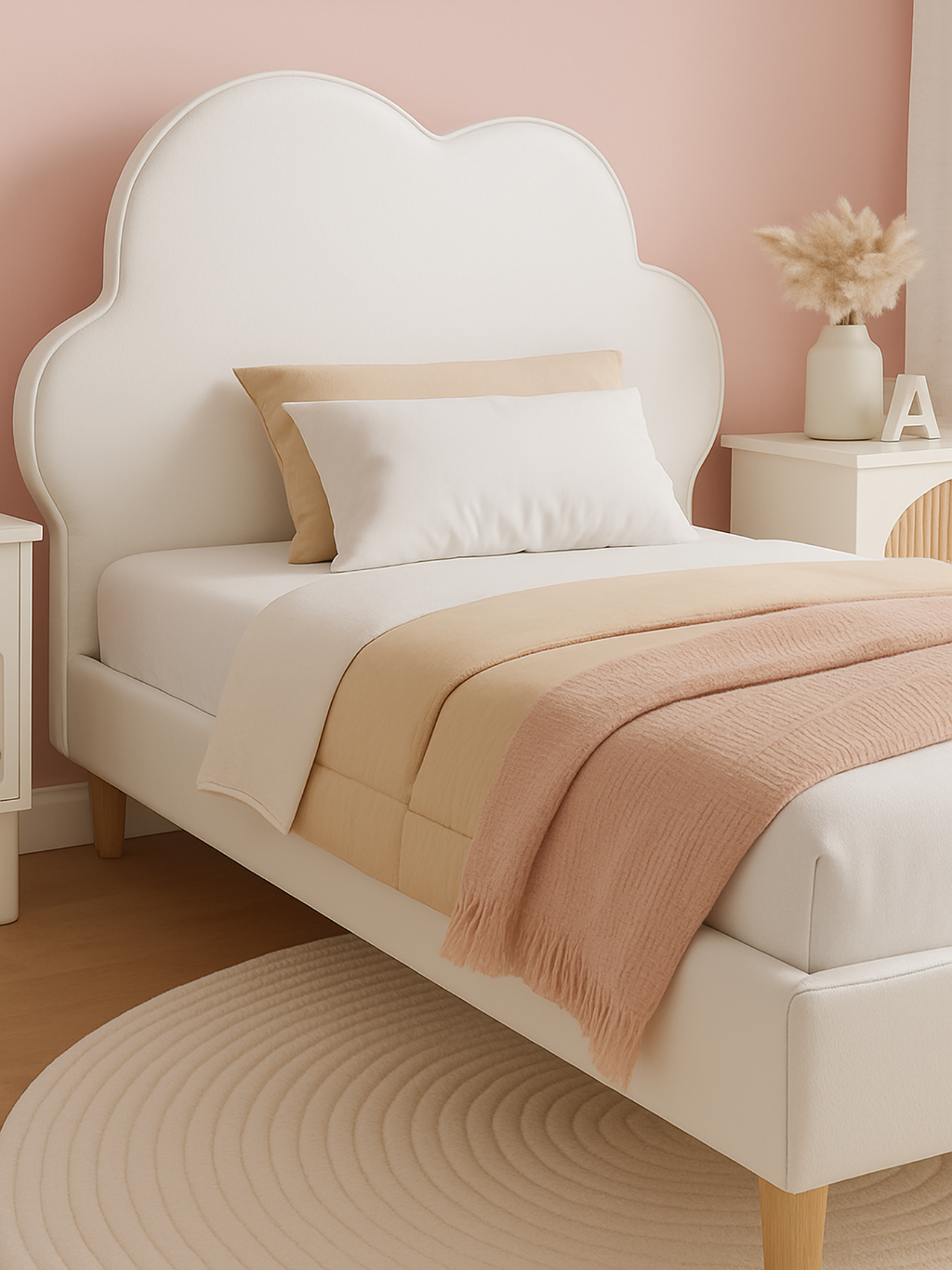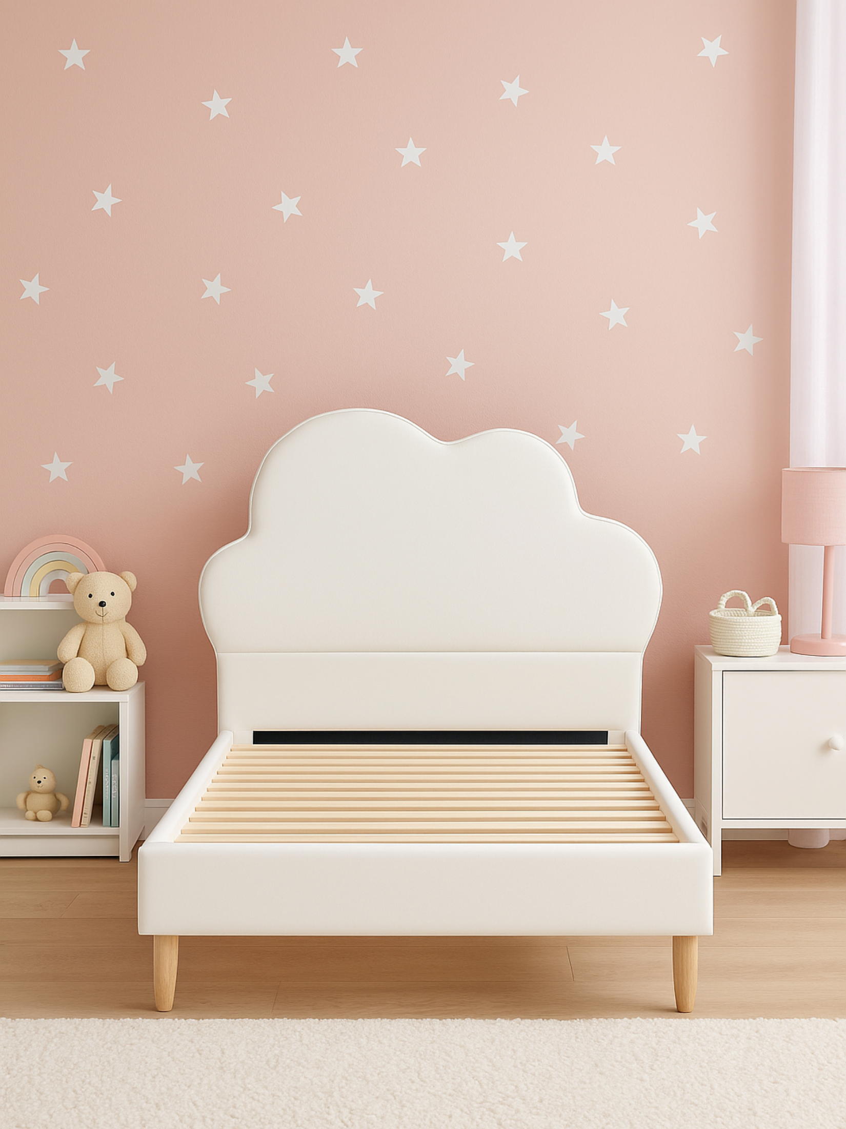 Create a dreamy escape for your little one with the Madeline Cloud Kids Single Bed Frame. Featuring a whimsical cloud-shaped headboard and wrapped in luxurious faux leather, this bed combines soft curves with everyday comfort. It’s the perfect centrepiece for any stylish kids bedroom, offering durable support, easy cleaning, and imaginative flair.