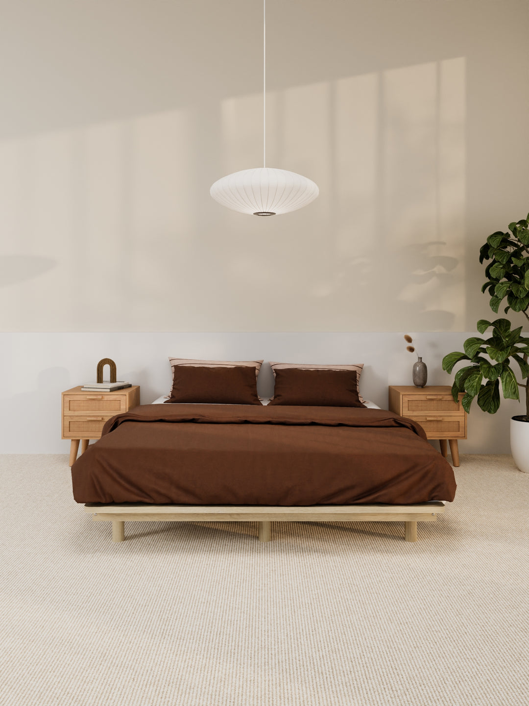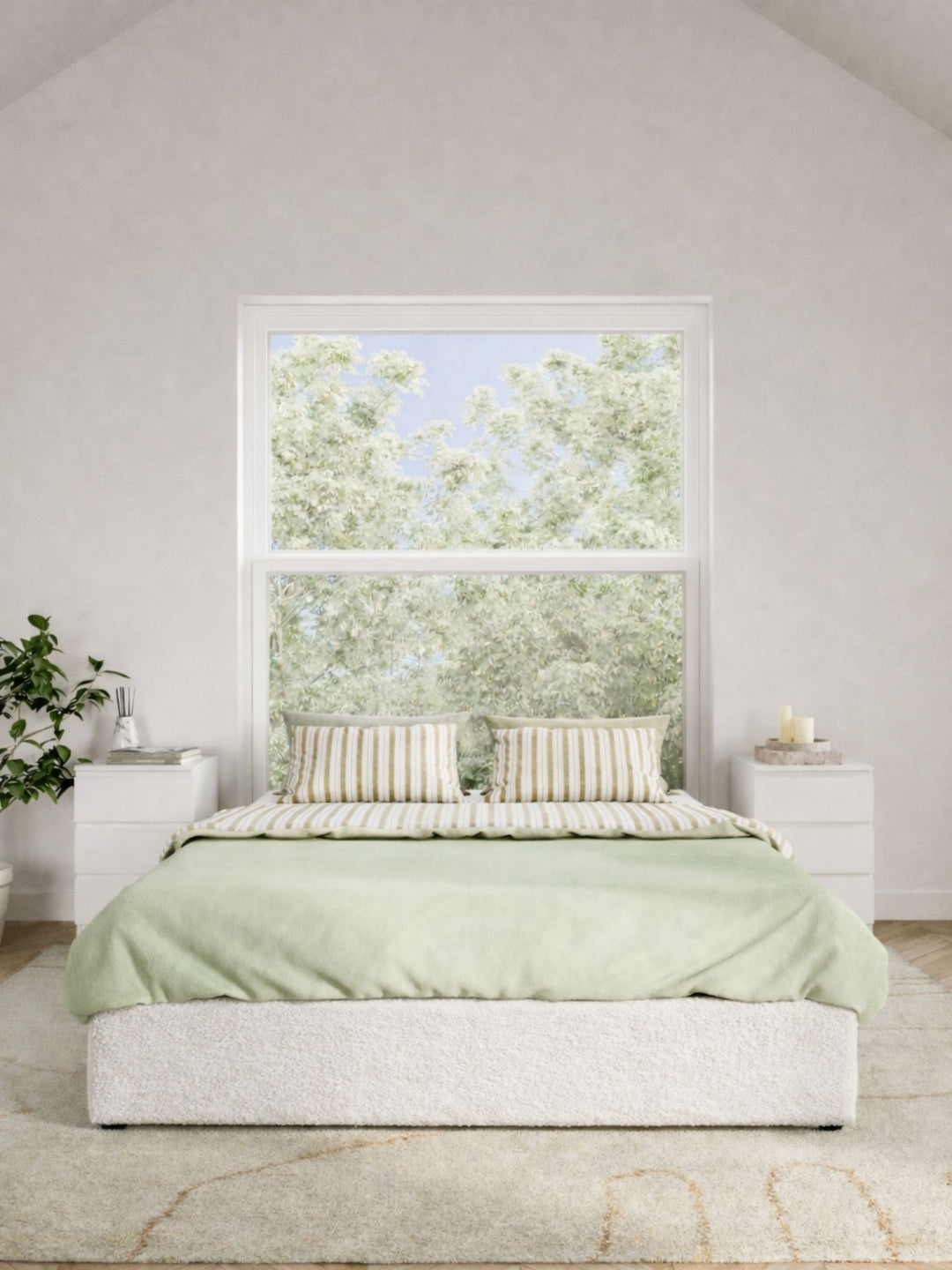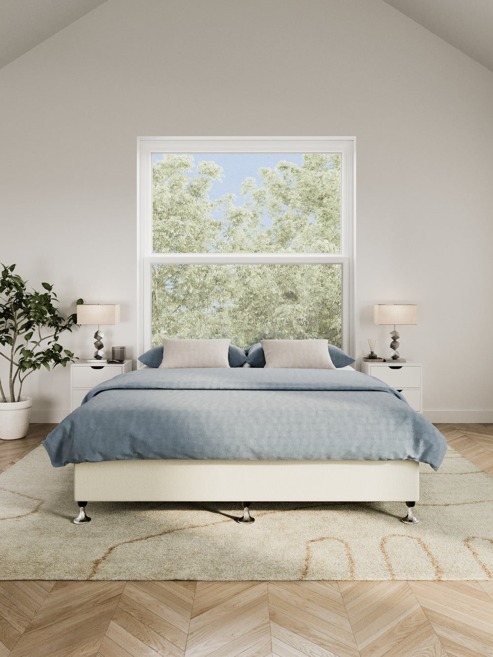 Contemporary bedroom featuring the Ventura Classic Wooden Bed Base in a clean, minimalist design. The natural light highlights the bed's sturdy construction and elegant finish, perfect for those looking to enhance their home with durable, stylish furniture. Paired with soft beige bedding and a lush view from the window, this bed base is ideal for modern décor enthusiasts.