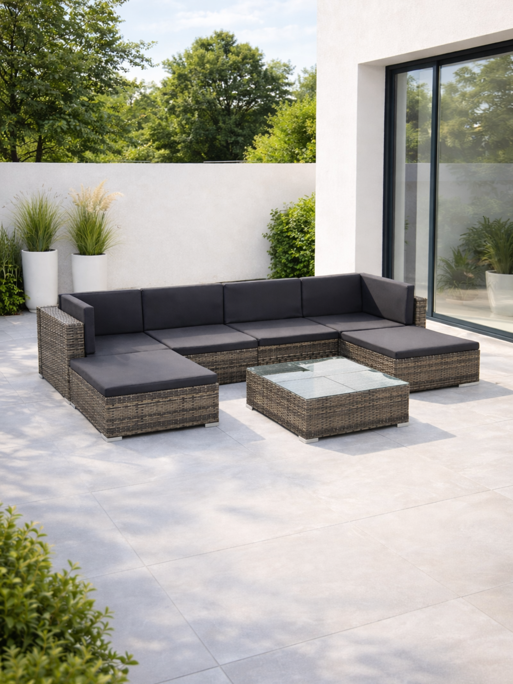 A contemporary grey rattan finish with dark grey cushions creates a sophisticated look for any outdoor setting.