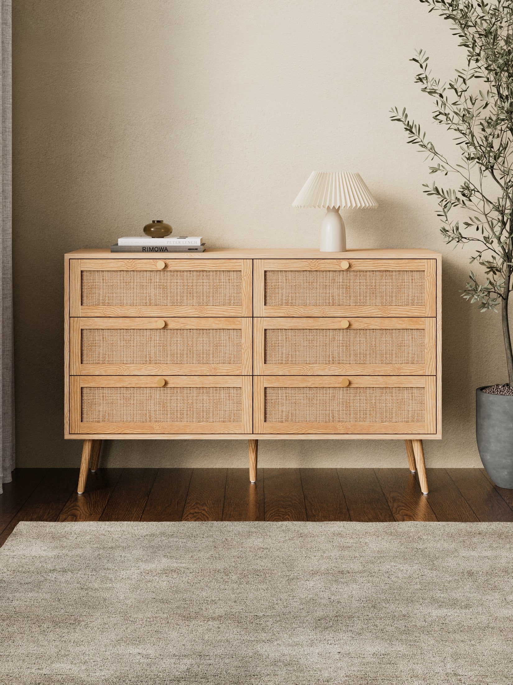 Add elegance and practicality to your home with the Sarah Natural Rattan 6-Drawer Dresser. Featuring a stunning blend of wood-finish and genuine rattan drawer panels, this dresser brings a unique texture and depth to any room. Its six spacious drawers offer ample storage for clothing and personal items, while the gold-colour handles provide a touch of glamour and easy use.