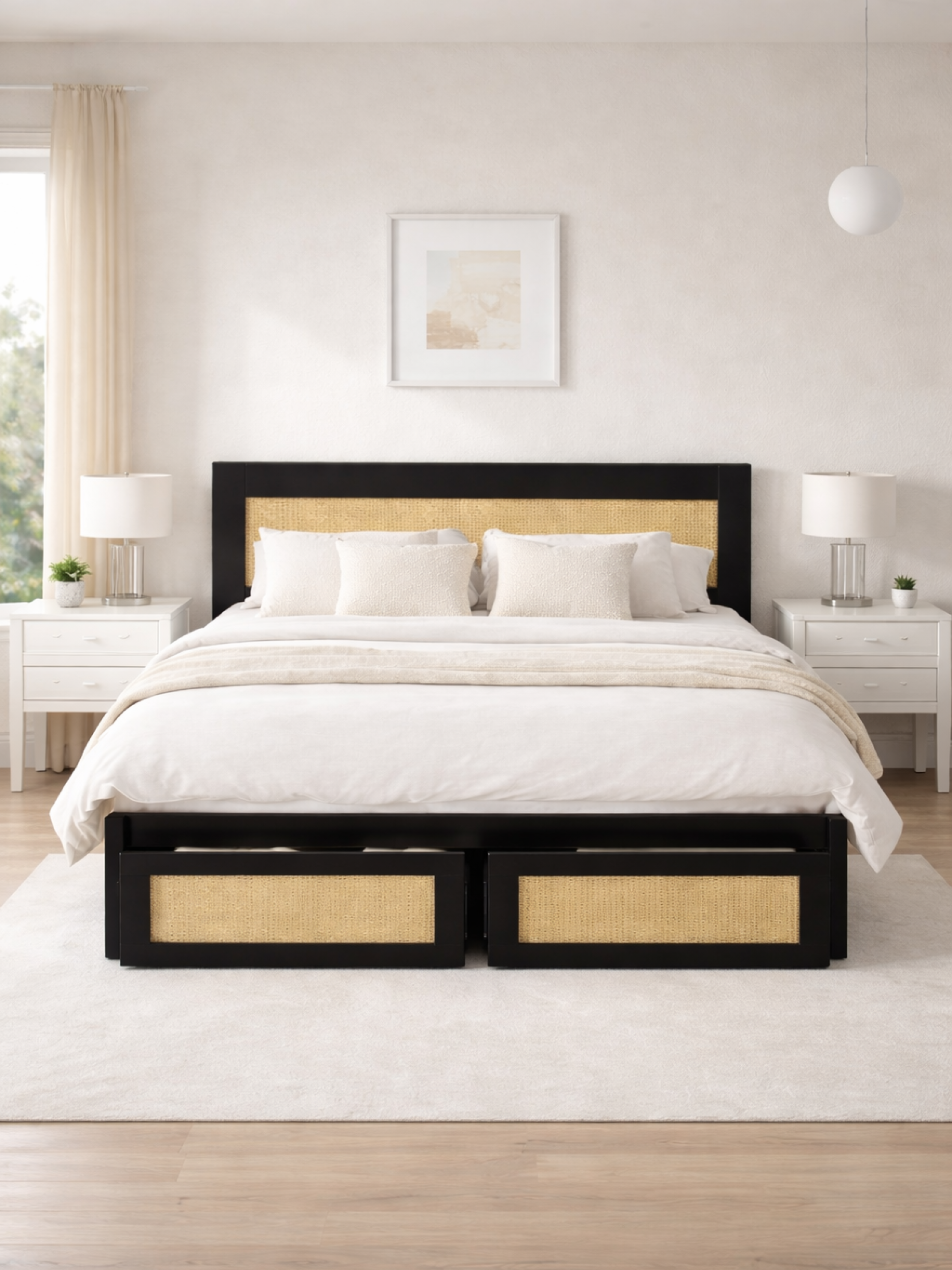 A beautifully detailed rattan headboard adds warmth and texture, creating a relaxed and inviting bedroom centrepiece.