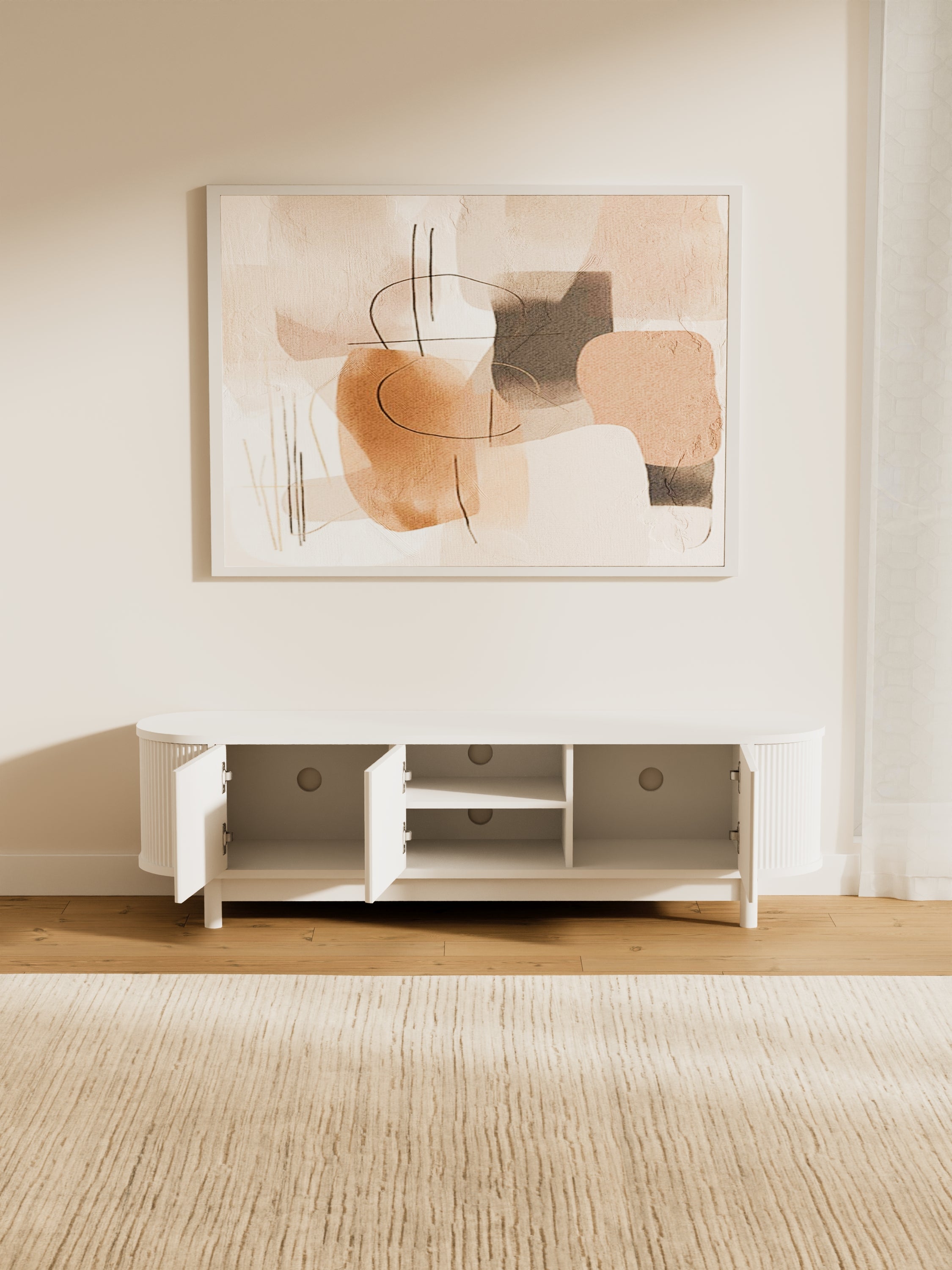 Upgrade your living room with the Zephyr Curved Entertainment Unit, featuring a modern oval design, reeded cabinet fronts, ample storage, durable construction, and built-in cable management.